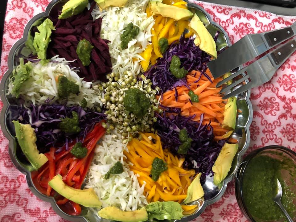 Strips of red and green cabbage, beetroot, red and yellow pepper, carrots, butternut squash, mung sprouts and avocado slices with a mint coriander dressing.