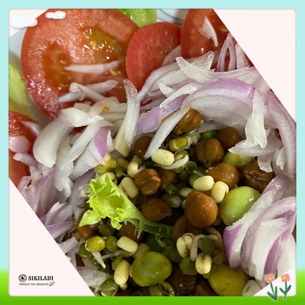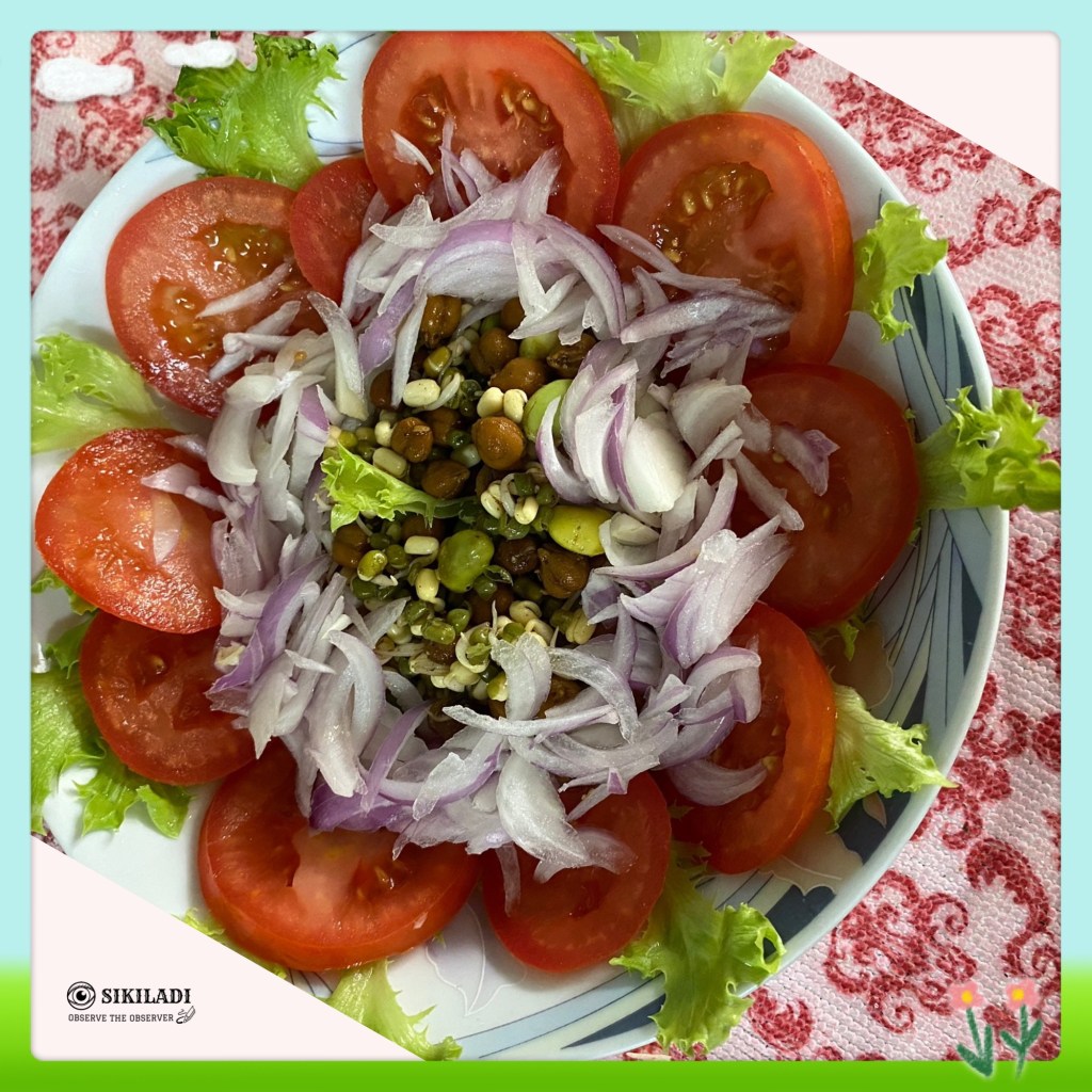 This is a very simple yet refreshing salad during the warm season. The proteins and vitamins from the sprouts and beans provide the nutrition value. The onions help with fighting heat strokes and the tomatoes give the cooling effect.