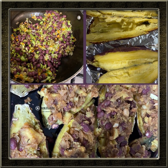 Place scoops full of the mixture into the hollowed sweet potatoes.