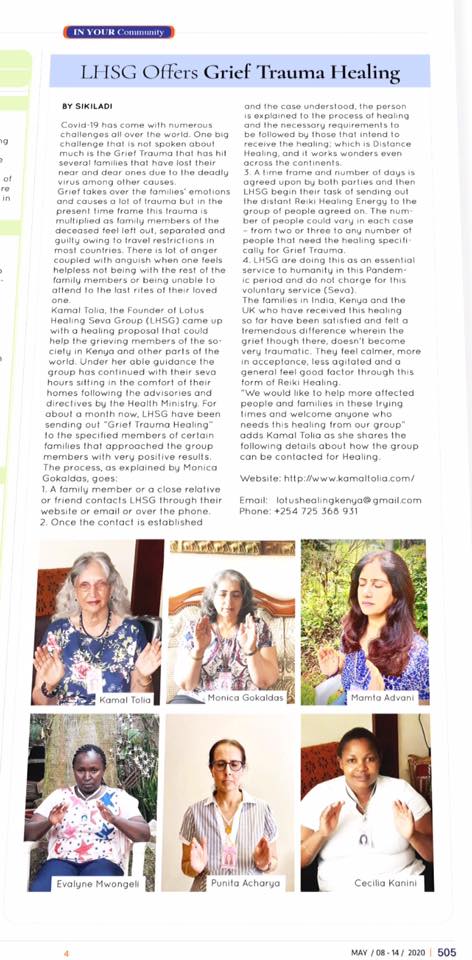 Kamal Tolia, the Founder of Lotus Healing Seva Group came up with a Healing proposal that could help the grieving members of the society in Kenya and other parts of the world. Under her able guidance the group has continued with their seva oriented hours sitting in the comfort of their homes following the advisories and directives by the Health Ministry. Since about a month now, LHSG have been sending out “Grief Trauma Healing” to the specified members of certain families that approached the group members with very positive results.
