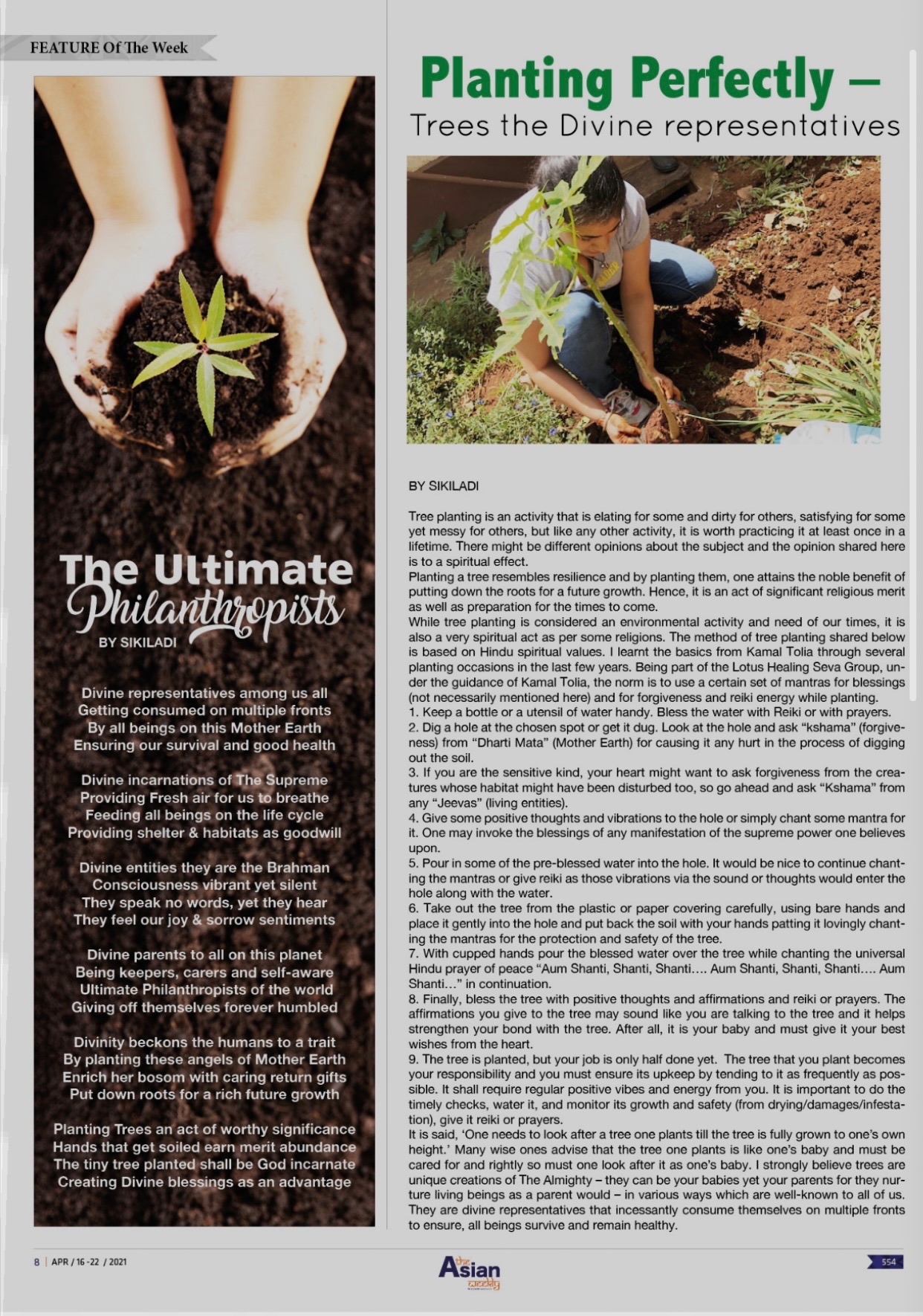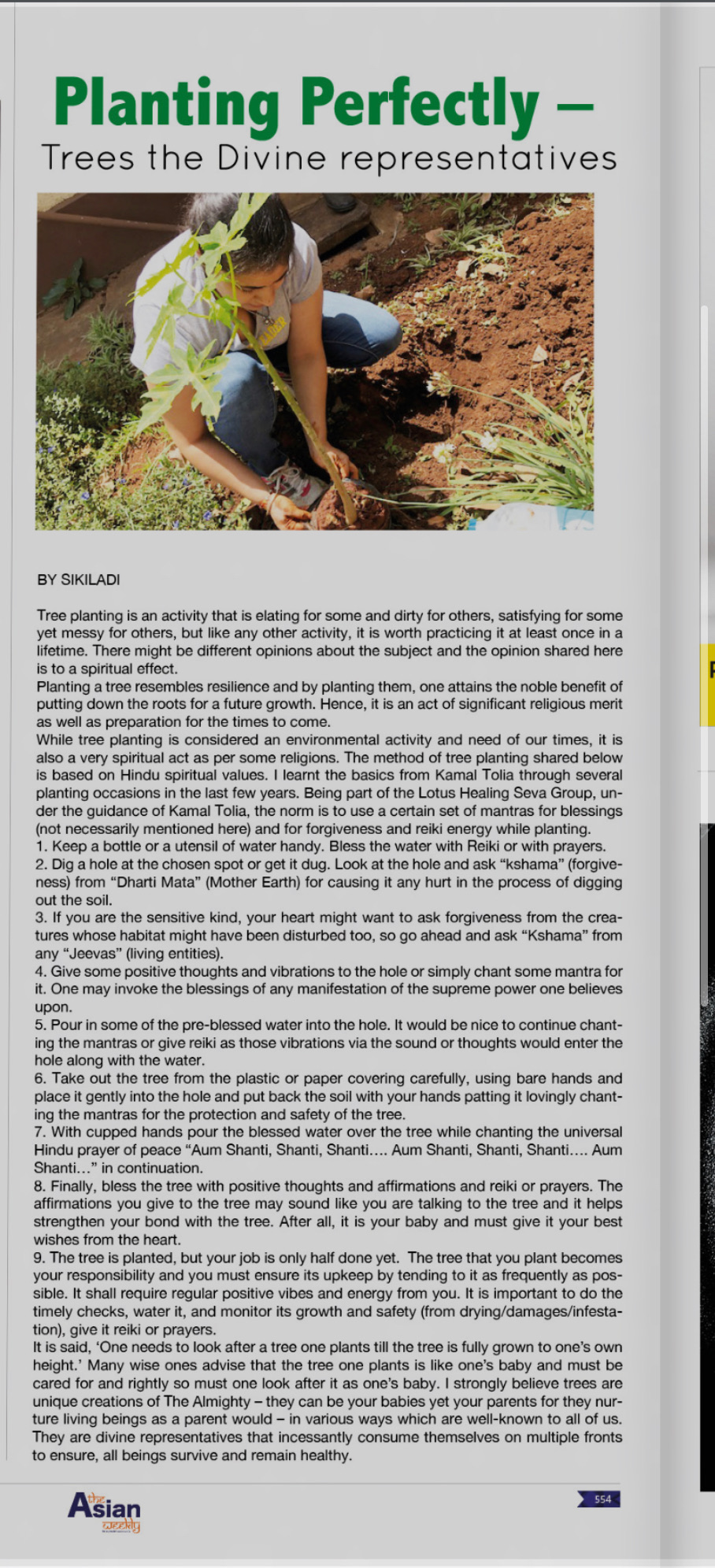 While tree planting is considered an environmental activity and need of our times, it is also a very spiritual act as per some religions. My knowledge being based on Hindu spiritual values I share the method of tree planting here as adapted having learnt some basics from Kamal Tolia at several planting occasions through the years. Being part of the Lotus Healing Seva Group under the guidance of Kamal Tolia, the norm is to use a certain set of mantras for blessings (not necessarily mentioned here) and for forgiveness and reiki energy while planting.