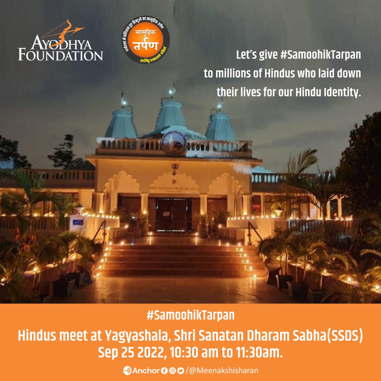 Sarva Pitra Amavasya was marked by Ayodhya Foundation at Shree Sanatan Dharam Mandir, Nairobi on Sunday, 25th September before mid-morning. Nearly 50 men, women and a few youngsters collectively performed a Samuhik Shraadh Tarpan not only of their family ancestors but also for several thousands of Hindu ancestors who lost their lives in their efforts to protect Bharat Mata and their Hindu Dharma over the many centuries of invasions and attacks.