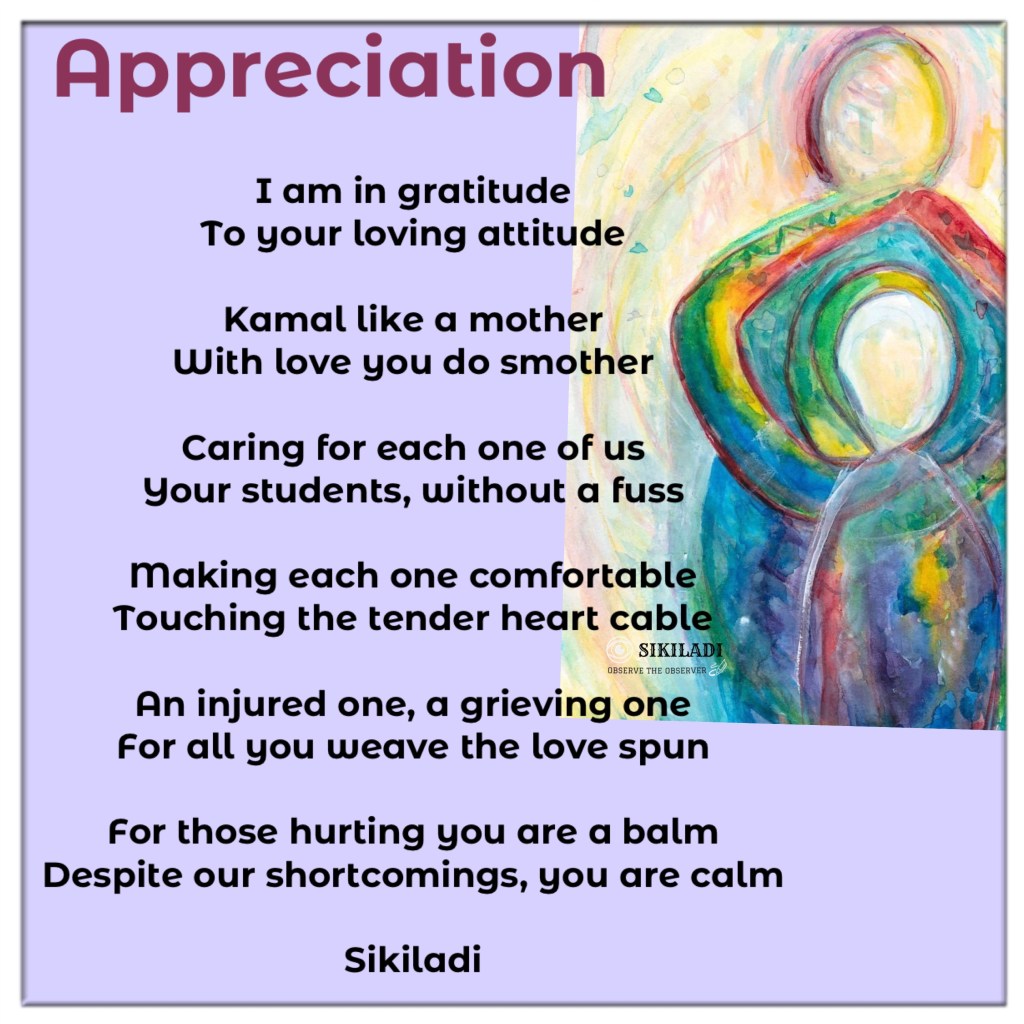 Appreciation! Image ~ March 16, 2023 ~ Sikiladi An appreciation post! Appreciation for the unconditional love imparted by Kamal Tolia towards her group members and non group members at Lotus Healing Seva Group. Share this: Click to share on X (Opens in new window) X Click to share on Facebook (Opens in new window) Facebook Like Loading... Related