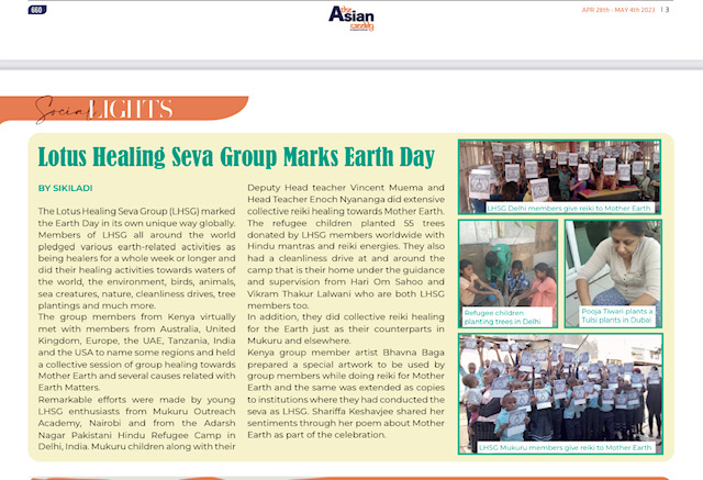 Kenya group member Bhavna Baga being an artist prepared a special artwork to be used by group members while doing reiki for Mother Earth and the same was extended as copies to institutions where they had conducted the seva as being members of Lotus Healing Seva Group. Shariffa Keshavjee shared her sentiments through her poem about Mother Earth as part of Earth Day celebration.