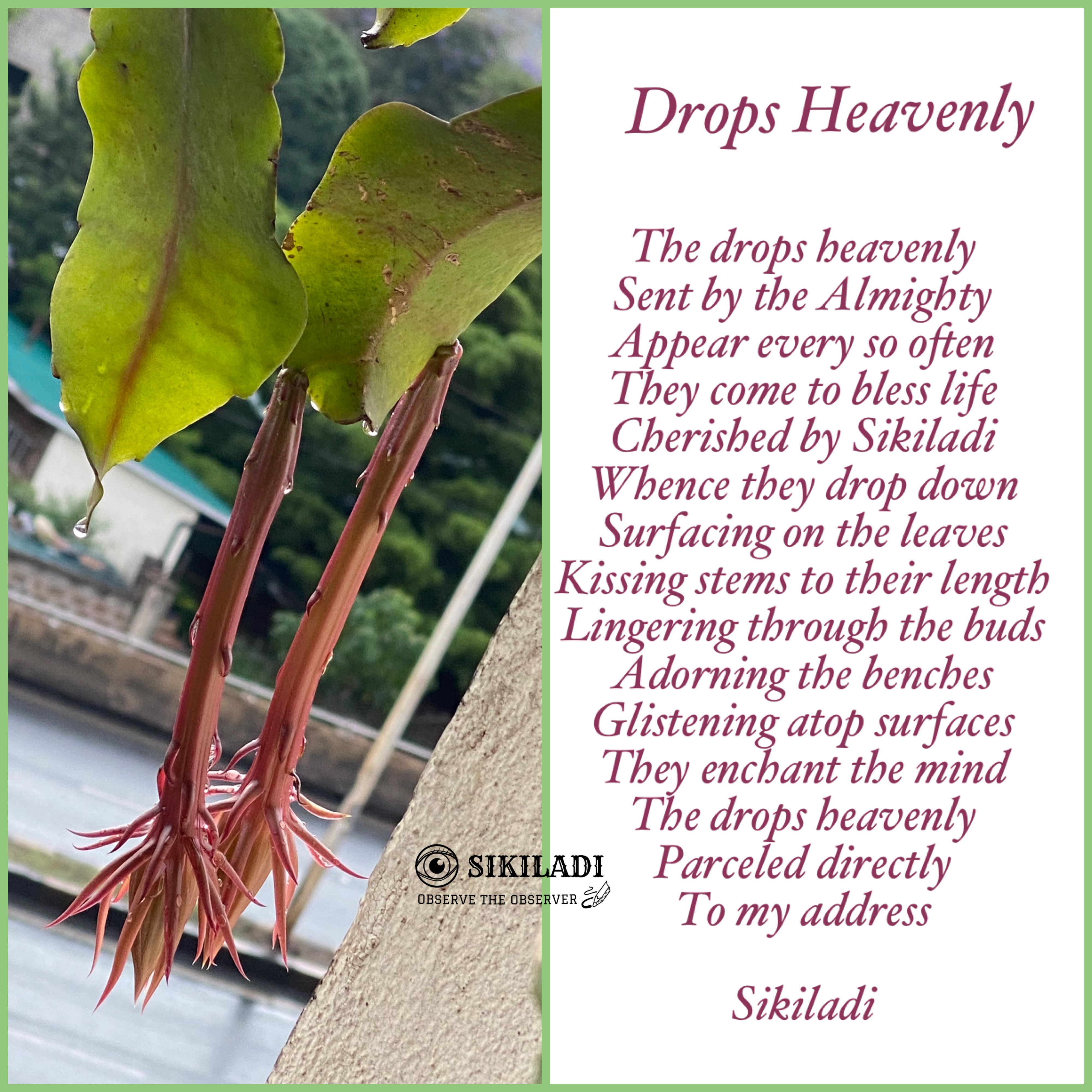 Drops Heavenly! Image ~ November 2, 2023 ~ Sikiladi Share this: Click to share on X (Opens in new window) X Click to share on Facebook (Opens in new window) Facebook Like Loading... Related