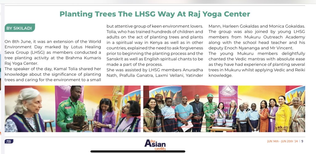 Lotus Healing Seva Group has been planting trees in our own special way, using Reiki, Ho’oponopono Forgiveness and our Hindu mantras, since 2012. In October last year, we were approached by the head of the Brahma Kumaris Foundation Sr Vedanti and by Sr Pratibha to join them in their celebration of 50 years in Africa, by holding our own workshops / talks at their Raj Yoga Centre in Nairobi.