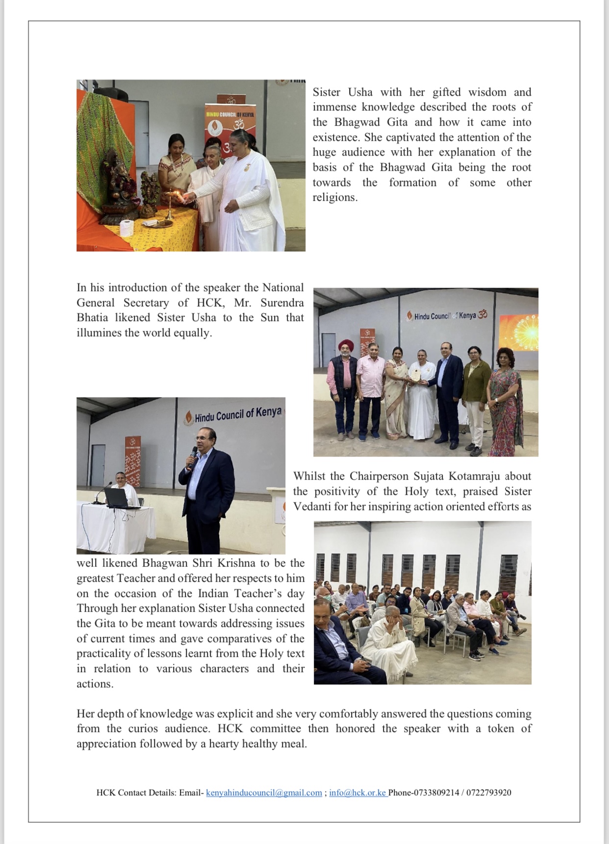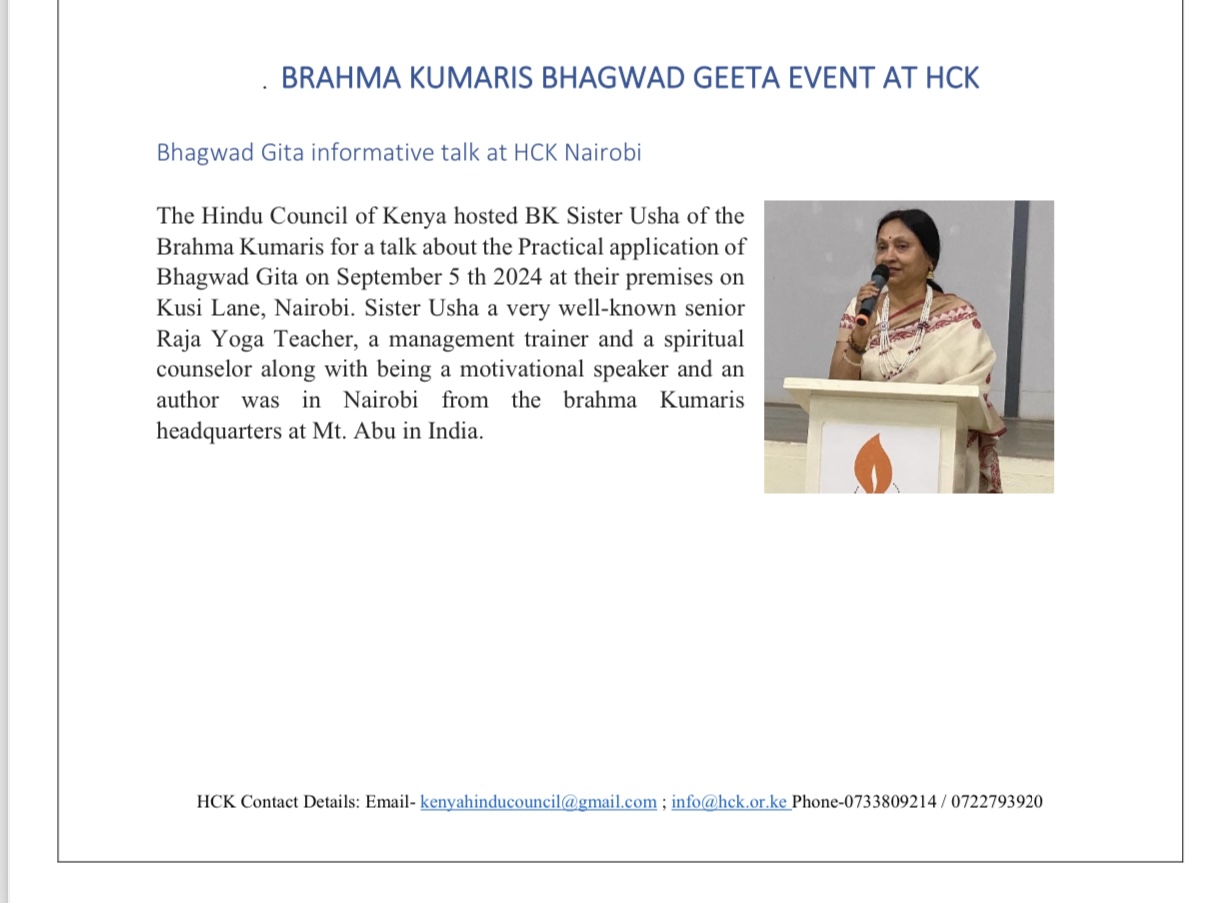 BK Usha at HCK: Practicality of Bhagwad Geeta October 3, 2024 ~ Sikiladi Published in Hindu Deep, September 2024 Edition by Hindu Council of Kenya. A report by Monica Gokaldas Share this: Click to share on X (Opens in new window) X Click to share on Facebook (Opens in new window) Facebook Like Loading... Related