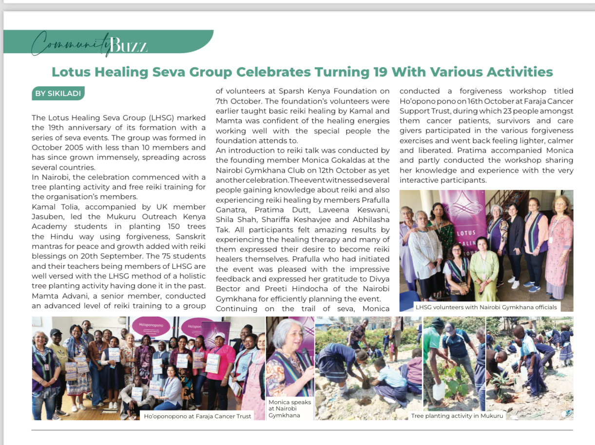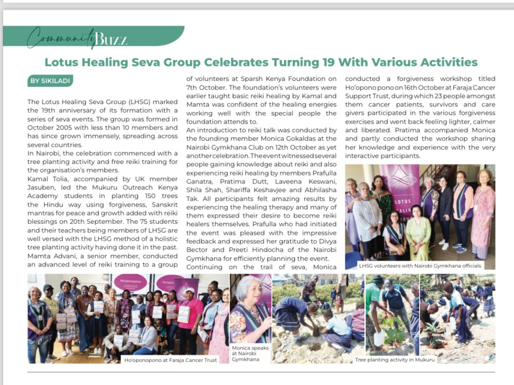 A seva ( selfless Seva) oriented group:Lotus Healing Seva Group is marking its 19th Anniversary in October 2024. The celebration is not a party, not a cake but doing more and more seva.