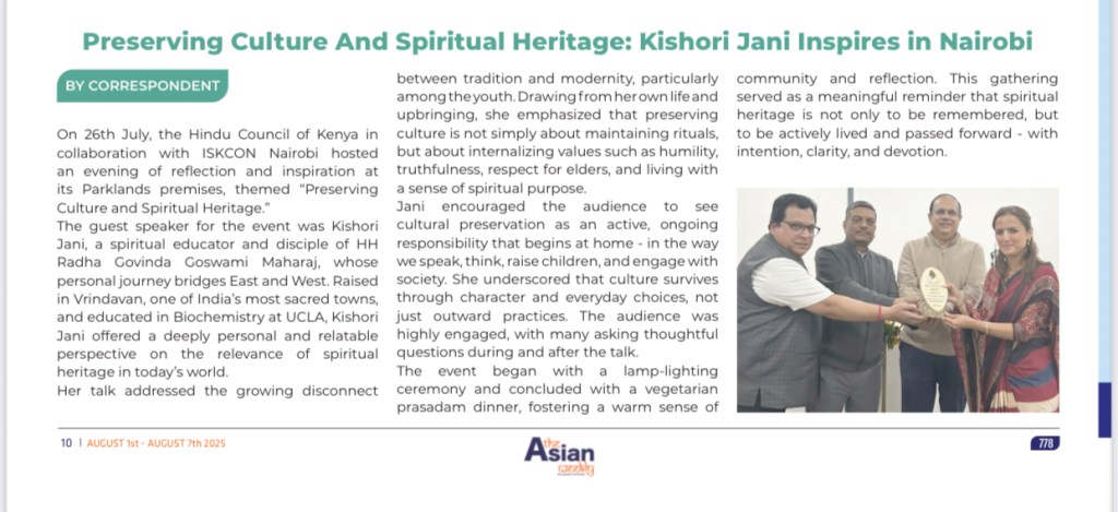 Hindu Council of Kenya with Collaboration with ISKCON Temple Organized a talk on Preserving Culture and Spiritual Heritage by Mata Kishori Jani