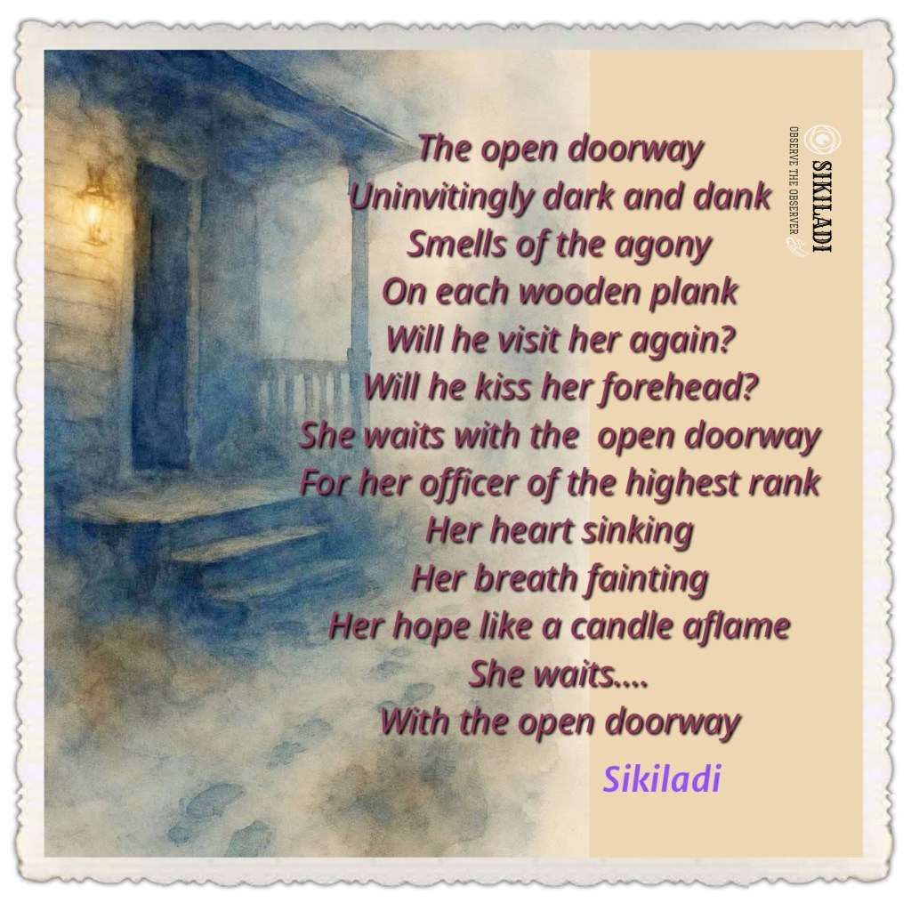The Open Doorway! September 6, 2025 ~ Sikiladi She waits ….. that’s her fate! Share this: Click to share on X (Opens in new window) X Click to share on Facebook (Opens in new window) Facebook Like Loading... Related