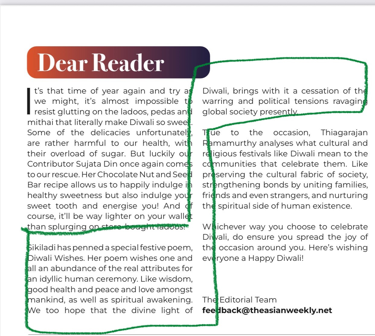 Diwali Wishes! October 17, 2025October 17, 2025 ~ Sikiladi Published in The Asian Weekly, Edition 789 Share this: Click to share on X (Opens in new window) X Click to share on Facebook (Opens in new window) Facebook Like Loading... Related