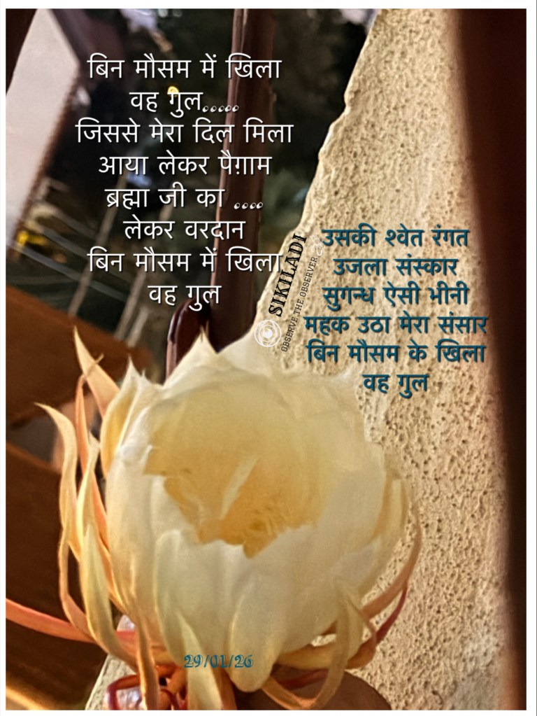 वह गुल… Image ~ January 29, 2026 ~ Sikiladi ब्रह्मकमल! The Brahmakamal often blooms in clusters and numbers but when the occasion is special it comes as a blessing as just one alone. It reminds me of my journey alone , as alone, by alone ….to the alone…..all alone! Share this: Share on X (Opens in new window) X Share on Facebook (Opens in new window) Facebook Like Loading... Related