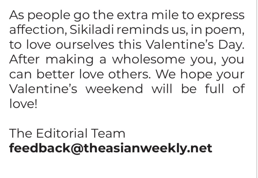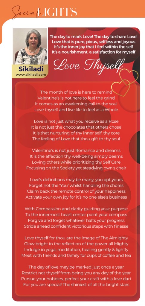 Love Thyself! (Valentine Poem) Image ~ February 13, 2026 ~ Sikiladi published in Edition 806, The Asian Weekly Screenshot Share this: Share on X (Opens in new window) X Share on Facebook (Opens in new window) Facebook Like Loading... Related