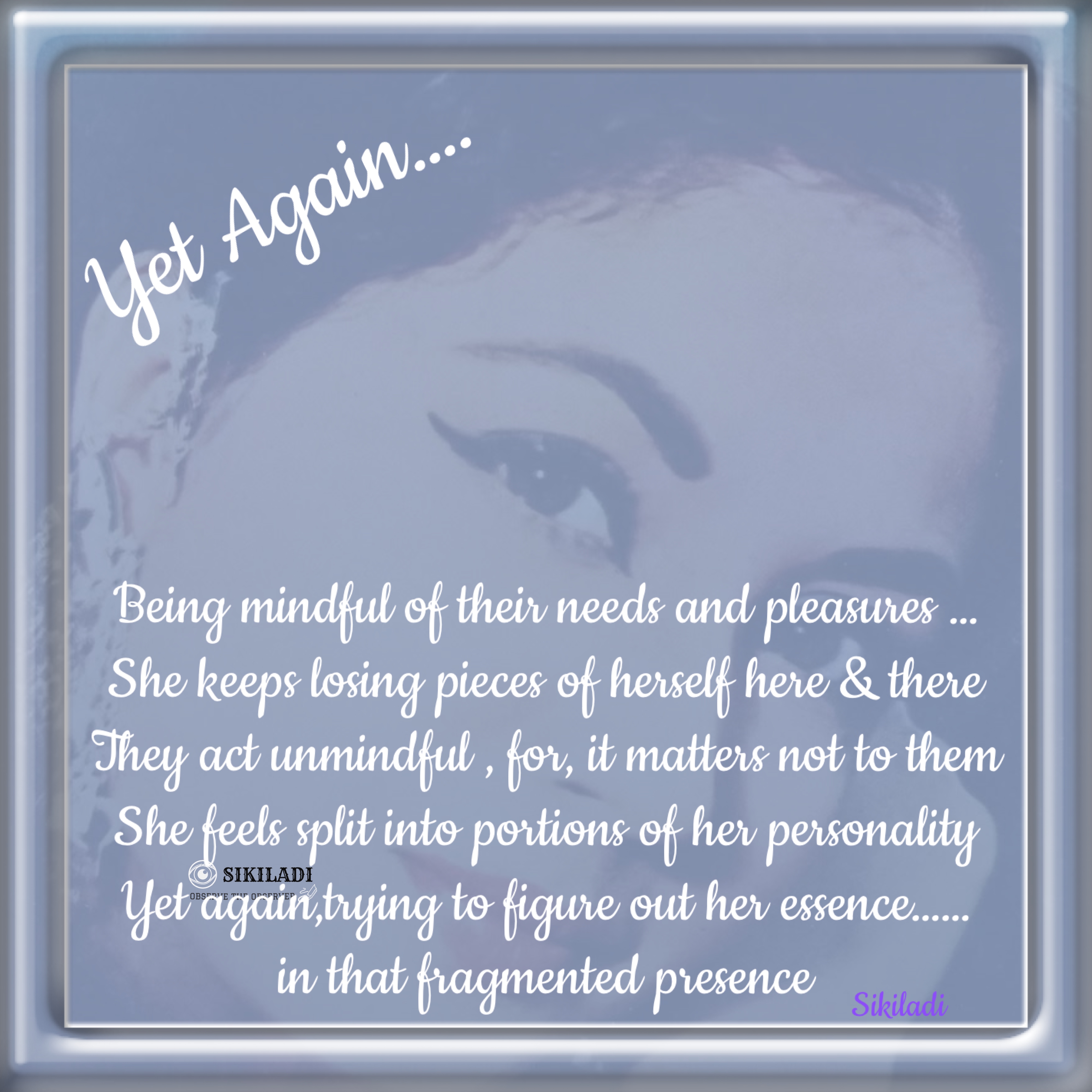 Yet Again….(part 2) April 18, 2026April 18, 2026 ~ Sikiladi She… Yet Again…. losing herself in bits and pieces ….. She exists! Share this: Share on X (Opens in new window) X Share on Facebook (Opens in new window) Facebook Like Loading... Related