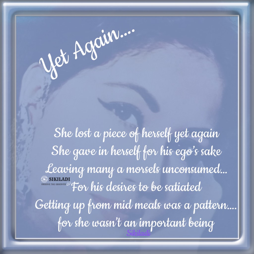 Yet Again….(part 5) April 21, 2026April 18, 2026 ~ Sikiladi She…. Yet again….. She is strong enough to withstand the challenges ….. She smiles through the pleasures and the grievances…. She exists! Share this: Share on X (Opens in new window) X Share on Facebook (Opens in new window) Facebook Like Loading... Related