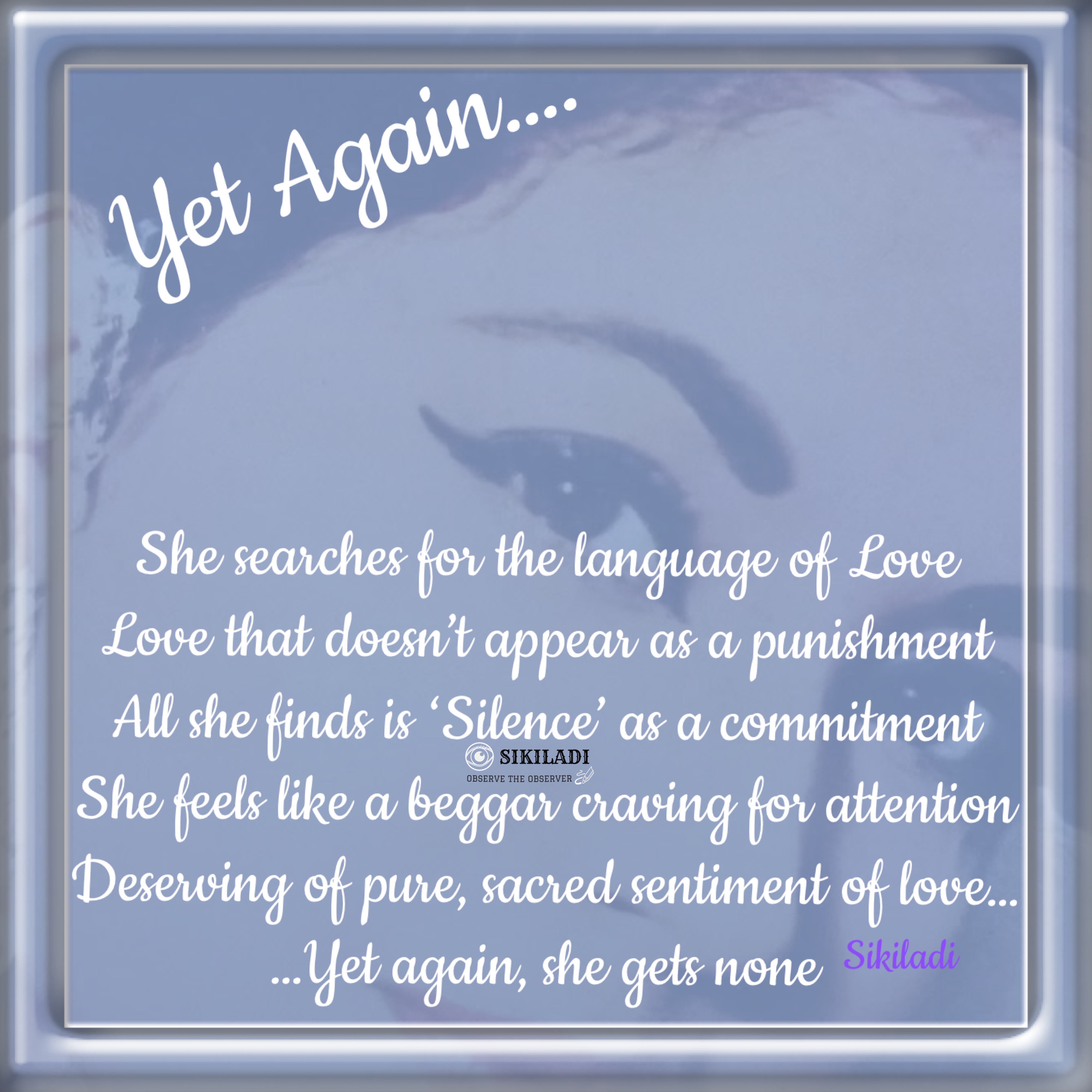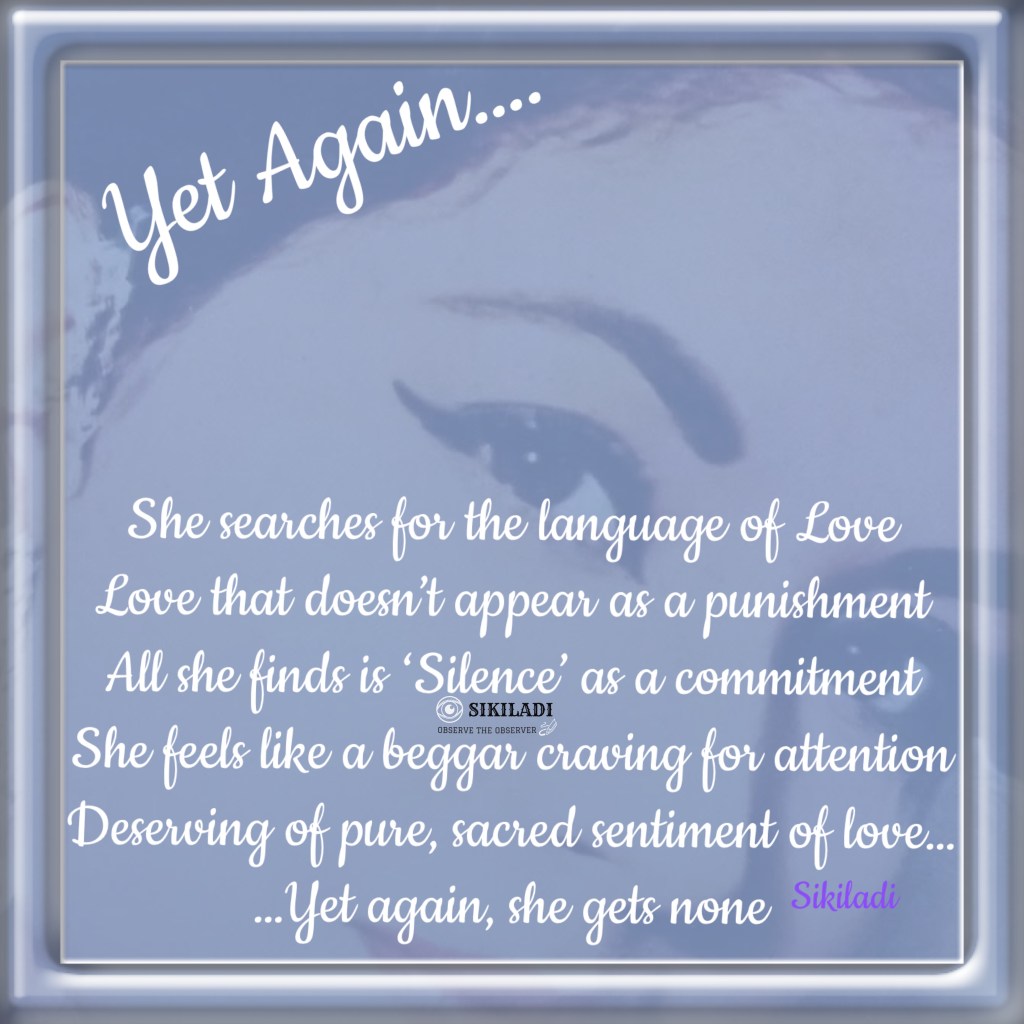 Yet Again….(part 8) April 24, 2026April 19, 2026 ~ Sikiladi She…. Yet again….. The tag of love upon her forehead as the red dot….. she still searches for love around her…. She exists Share this: Share on X (Opens in new window) X Share on Facebook (Opens in new window) Facebook Like Loading... Related